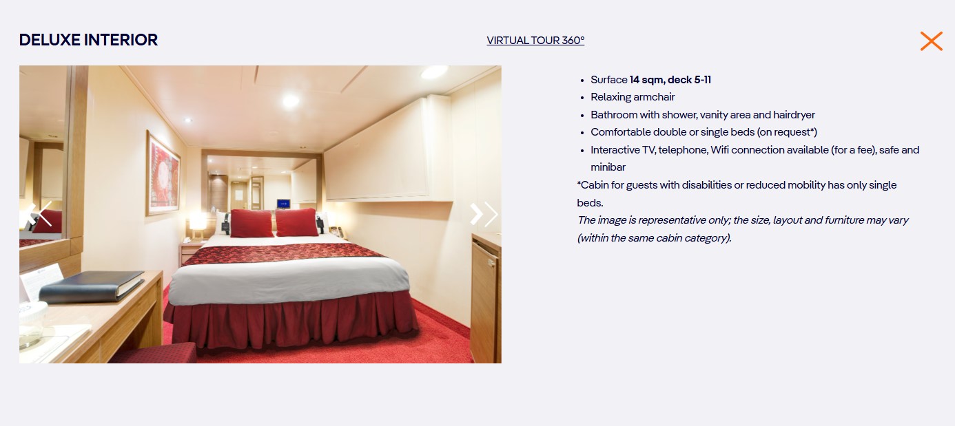 - Διαμονή σε εσωτερική καμπίνα. Εάν επιθυμείς σε εξωτερική καμπίνα (κατηγορίας Bella – ενδεχομένως με περιορισμένη θέα) το κόστος είναι +200 ευρώ/άτομο